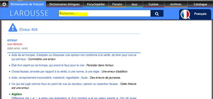 Quand je clique sur "dictionnaire français" sur le site de LAROUSSE afin d'obtenir le répertoire de tous les mots du dictionnaire, il est renvoyé une liste de quelque mots seulement. Et quand je clique sur un de ces mots (n'importe lequel), l'expression : "erreur 404" s'affiche et c'est la définition de "erreur" qui est donnée.