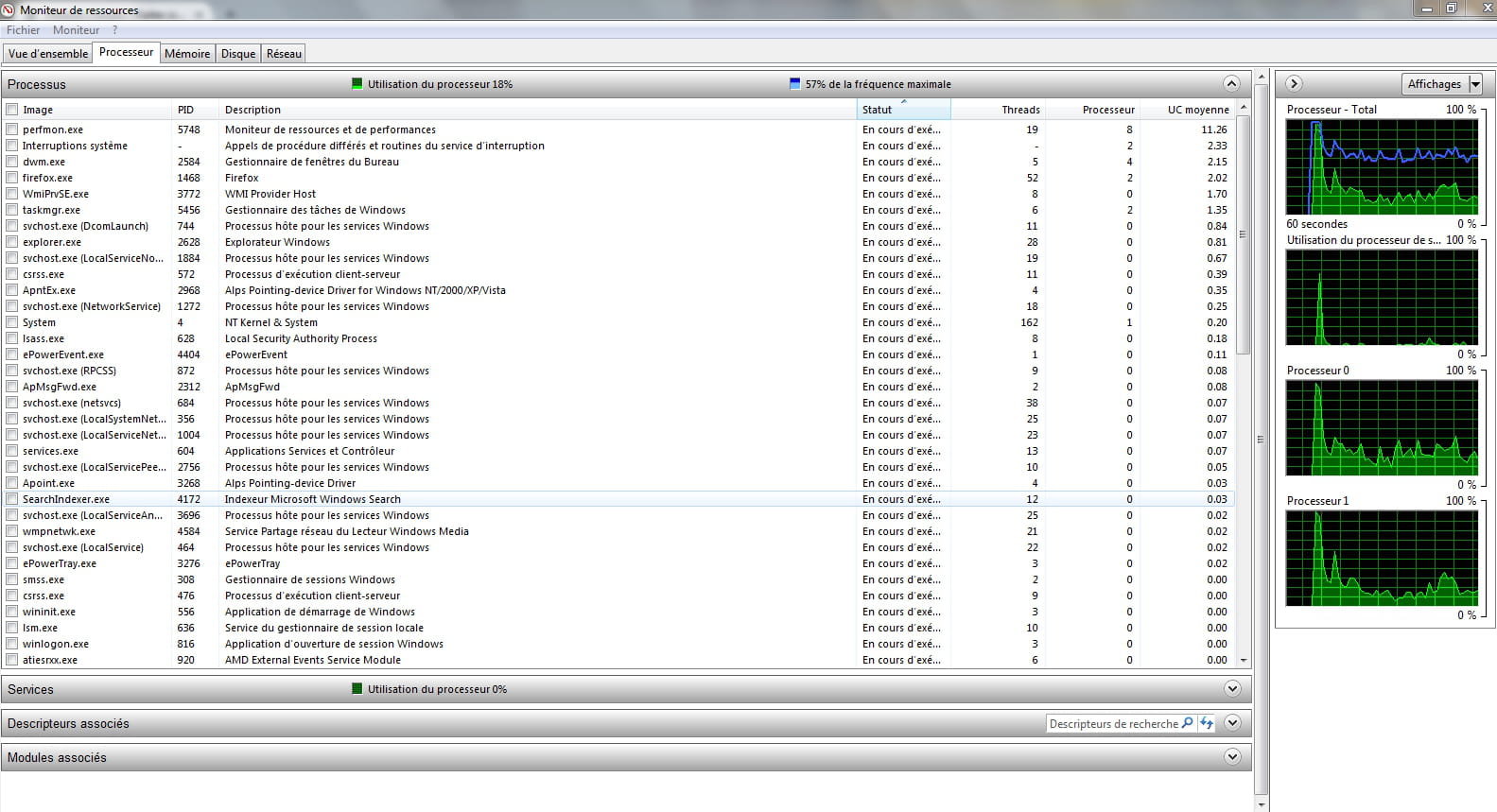 Le pc est un portable Packard Bell easynote, windows 7. Ce pc est un peu lent comme pour l'ouverture d'open office qui met prèsd'une minute à afficher le menu, trop lent en wifi, plus de 10 s pour charger la page, en filaire ça rame aussi mais moins. Le débit descendant de la bbox est de 7,4 M. Le signal est bon, le pc est en cause car les autres fonctionnent bien. Dans etat de connexion reseau sans fil, j'ai une vitesse de 54 Mbits/s et en cable j'ai une vitesse de 1,0 Gbits/s. La carte réseau est une atheros AR5B125 Wireless Network Adapter, j'ai regardé la connectique dans le pc, j'ai un seul connecteur noir branché, elle doit fonctionner comme ça car je n'ai pas vu d'autres connecteurs, les pilotes sont à jours. je suis allé sur le site du constructeur et fait la manip de désinstaller et réinstaller les pilotes pour le wifi. j'ai scanné le pc, avast et malawarebytes rien, zhpcleaner a trouvé 2 choses, j'ai conservé le rapport. Je ne sais pas si c'est un virus ou si c'est un pilote qui prend de la ressource au pc, firefox est à jour, je vide le cache à chaque utilisation, j'ai regardé dans le gestionnaire de tâches, moniteur de ressource, firefox est à 52 dans la colonne thread et par contre j'ai une valeur de 162 pour NT Kernel et System avec une juste une page internat ouverte au moment de la mesure.