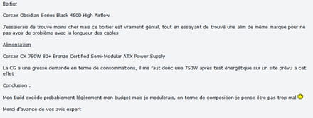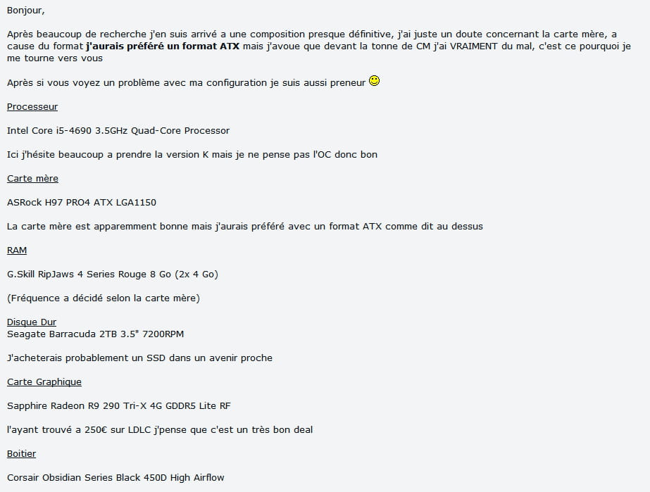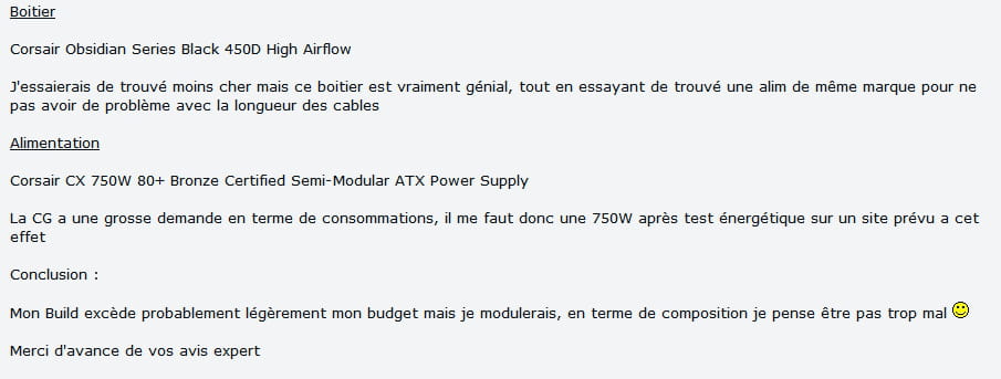 Bonjour, la config est plutôt cohérente mais tu n'as pas besoin d'une alimentation de 750W, un modèle 600W de bonne qualité sera suffisant. La carte mère est bien en ATX comme confirmé dans son nom...