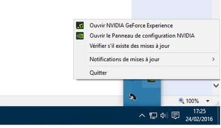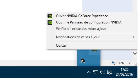 est ce que tu vois ceci en bas à droite de ton écran, si oui, fais un clique droit dessus, puis ouvre le centre GeForce Experience ou son panneau de configuration pour voir !