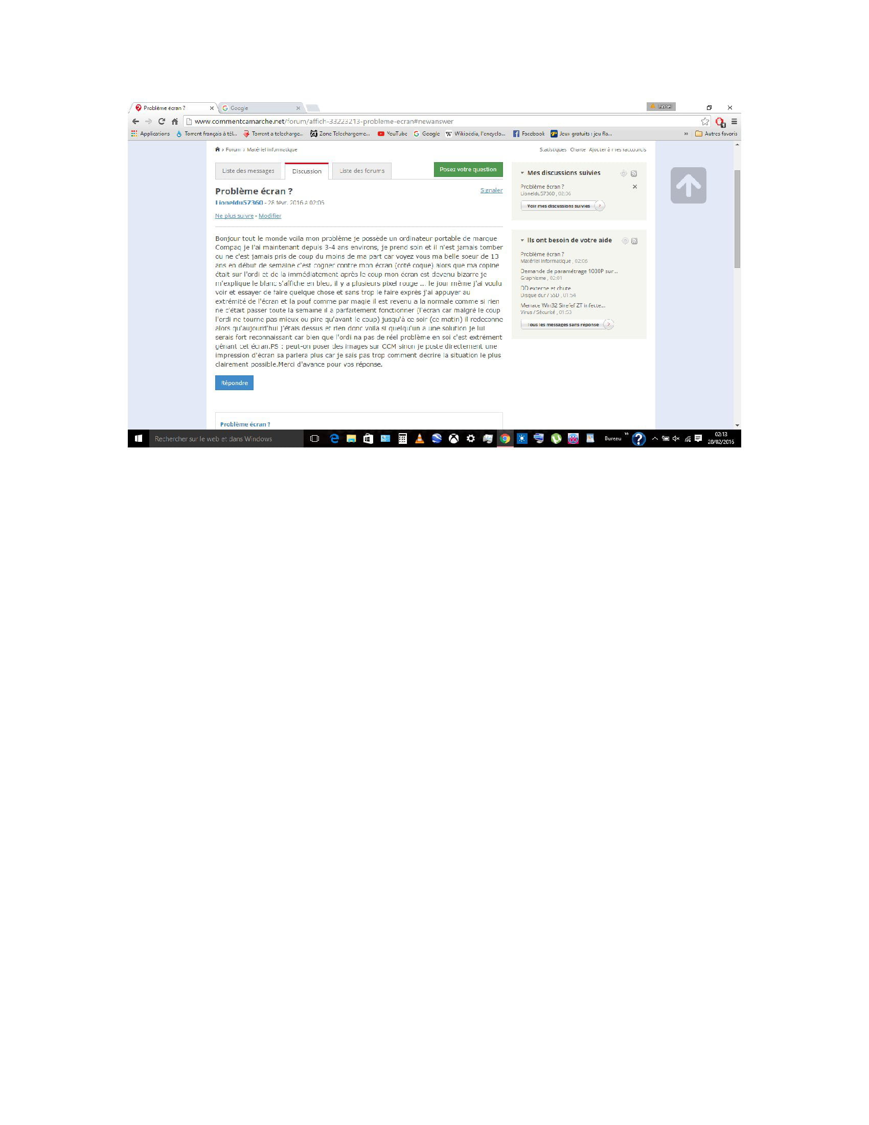 Bonjour tout le monde voila mon problème je possède un ordinateur portable de marque Compaq je l'ai maintenant depuis 3-4 ans environs, je prend soin et il n'est jamais tomber ou ne c'est jamais pris de coup du moins de ma part car voyez vous ma belle soeur de 13 ans en début de semaine c'est cogner contre mon écran (coté coque) alors que ma copine était sur l'ordi et de la immédiatement après le coup mon écran est devenu bizarre je m'explique le blanc s'affiche en bleu, il y a plusieurs pixel rouge ... le jour même j'ai voulu voir et essayer de faire quelque chose et sans trop le faire exprès j'ai appuyer au extrémité de l'écran et la pouf comme par magie il est revenu a la normale comme si rien ne c'était passer toute la semaine il a parfaitement fonctionner (l'écran car malgré le coup l'ordi ne tourne pas mieux ou pire qu'avant le coup) jusqu'à ce soir (ce matin) il redeconne alors qu'aujourd'hui j'étais dessus et rien donc voila si quelqu'un a une solution je lui serais fort reconnaissant car bien que l'ordi na pas de réel problème en soi c'est extrément gênant cet écran.PS : peut-on poser des images sur CCM sinon je poste directement une impression d'écran sa parlera plus car je sais pas trop comment décrire la situation le plus clairement possible.Merci d'avance pour vos réponse.