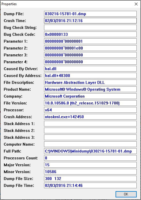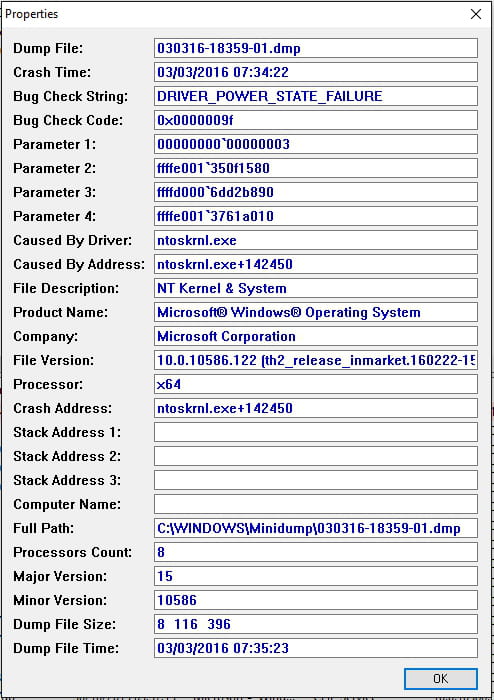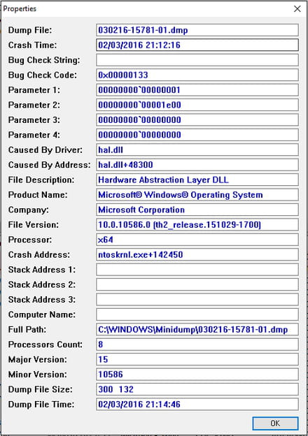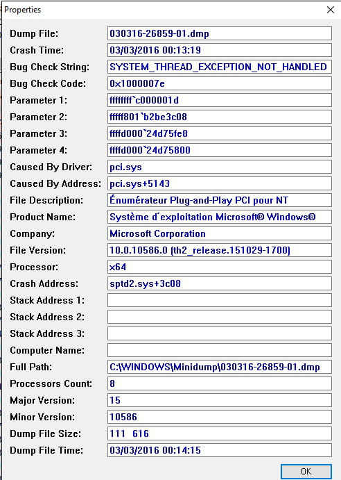 @ bendrop : voici les infos sur les BSOD. Celui dont la zone "Bug Check string" est vide correspond au second BSOD "DPC_watchdog_VIOLATION" que j'ai très fréquemment (avec DRIVER_POWER_STATE_FAILURE).