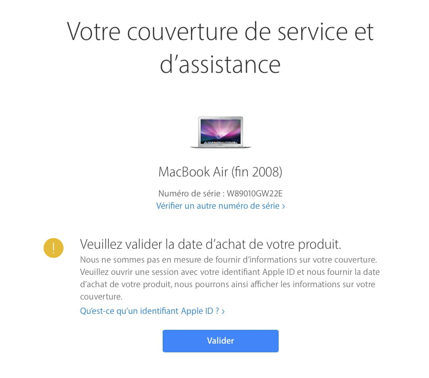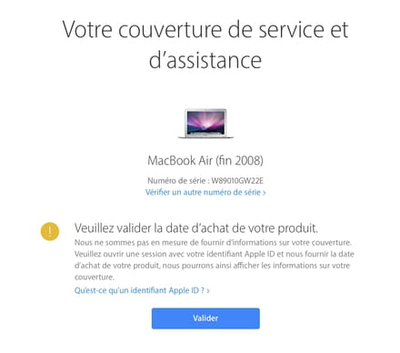 Votre n° de série correspond à un MacBook Air de fin 2008 dont la date d'achat n'a pas été validée.