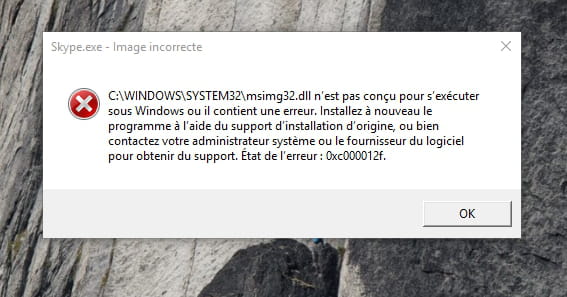 Bonjour, J'ai un gros problème avec mon ordinateur. J'ai un Toshiba Satellite p500 - 135, Il est sous Windows 10. Donc voila mon problème c'est que des que je lance un logiciel .exe , il y a une fenêtre qui apparaît avec écrit Image incorrecte et me disant que Msimg32.dll n'est pas conçu pour s'exécuter sous Windows ou il contient une erreur...