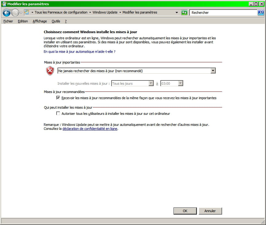 2- Clic sur Modifier les paramètres > sélectionnez Ne jamais rechercher les mise à jour (non recommandé) > OK puis fermer