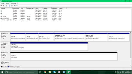Pour le deuxième problème, va dans gestionnaire de disques (ou gestion du disque en fonction de la version de Windows) et fait moi une capture d'écran si possible (tuto).