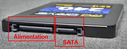 je viesn de récupérer deux branchements un peu au pif sur la tour ( j'ai défait un cable qui était connecté au lecteur dvd et j'ai récupéré une autre prise male qui etait compatible avec la prise femelle du SSD