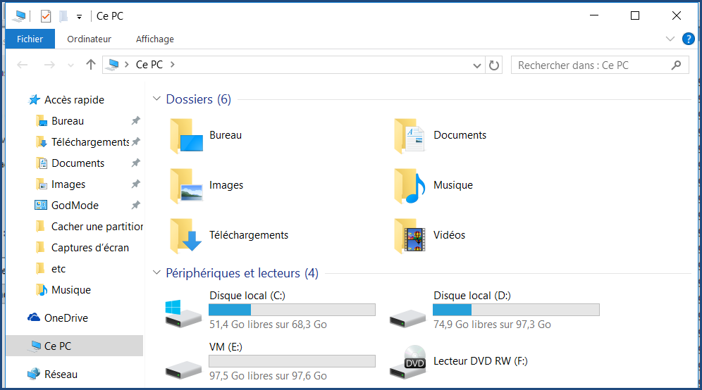 Sauf que la veille, j'avais un poste de travail beaucoup plus agréable. En effet, lorsque je l'ouvrais, j'avais les mêmes fichiers, sauf pour les disques durs ou ceux-ci étaient soulignés d'une barre bleu plus ou moins remplie en fonction de la place restante dedans.