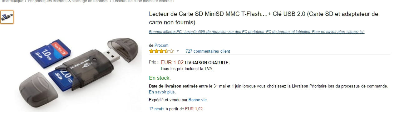Une autre idée : essayer un lecteur de carte externe : j'ai donc acheté celui-ci :