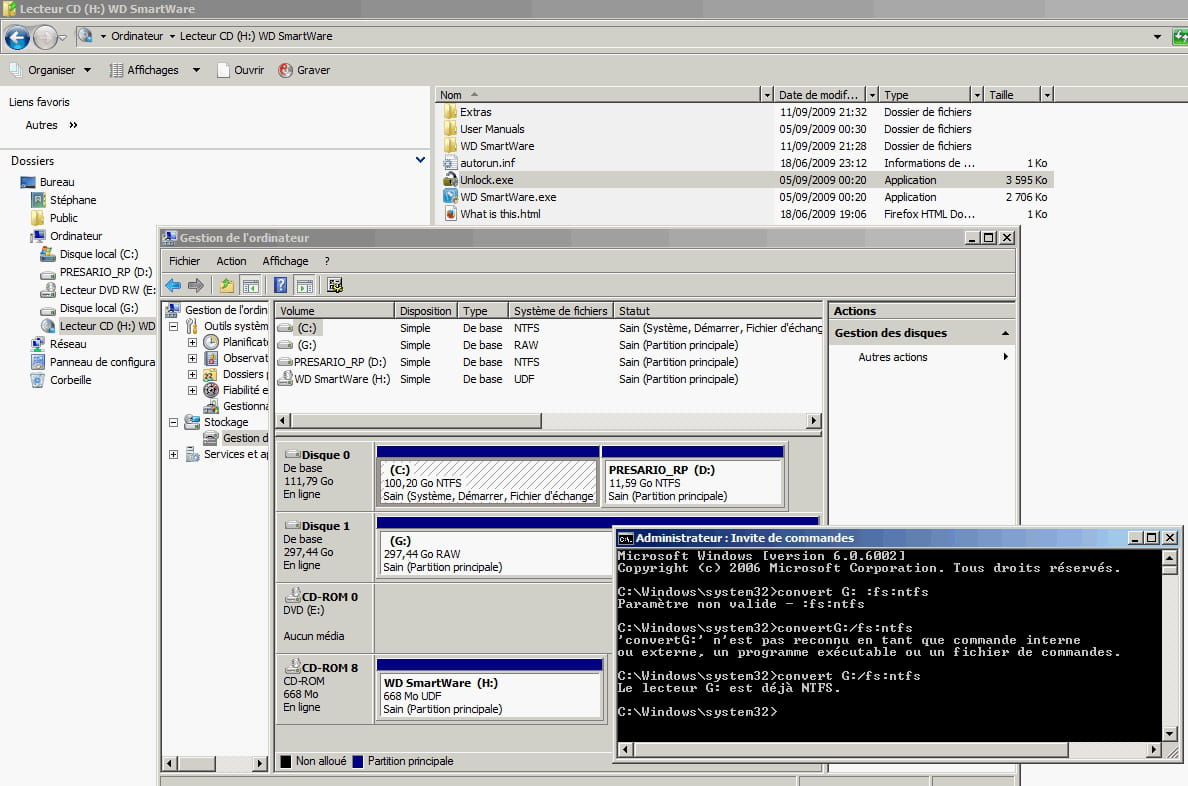 Alors voici mon problème j'ai un DD externe depuis quelques année maintenant qui a toujours fonctionné correctement j'ai pris le dernière version sur western digital de WDsmart celle ci me trouve mon my passeport (chose qui m'intéresse vu que tout mes fichier sont dedans) ors depuis ce matin j'ai comme problème le fait qu'il c'est déclaré RAW pour qui pourquoi je ne sait pas bref mes soucis: