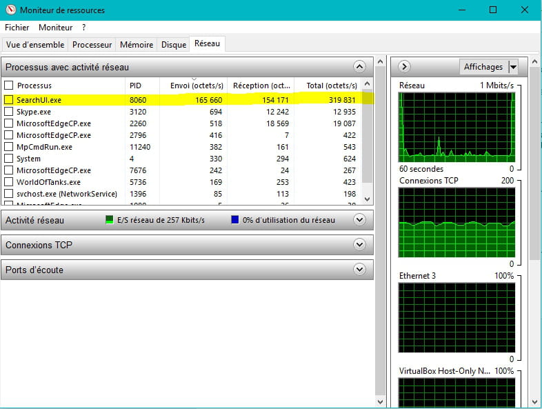 - D'abord, déterminez le programme qui pompe le Download ou l'Uppload, en tapant "resmon" dans exécuter (ou CMD, peu importe).