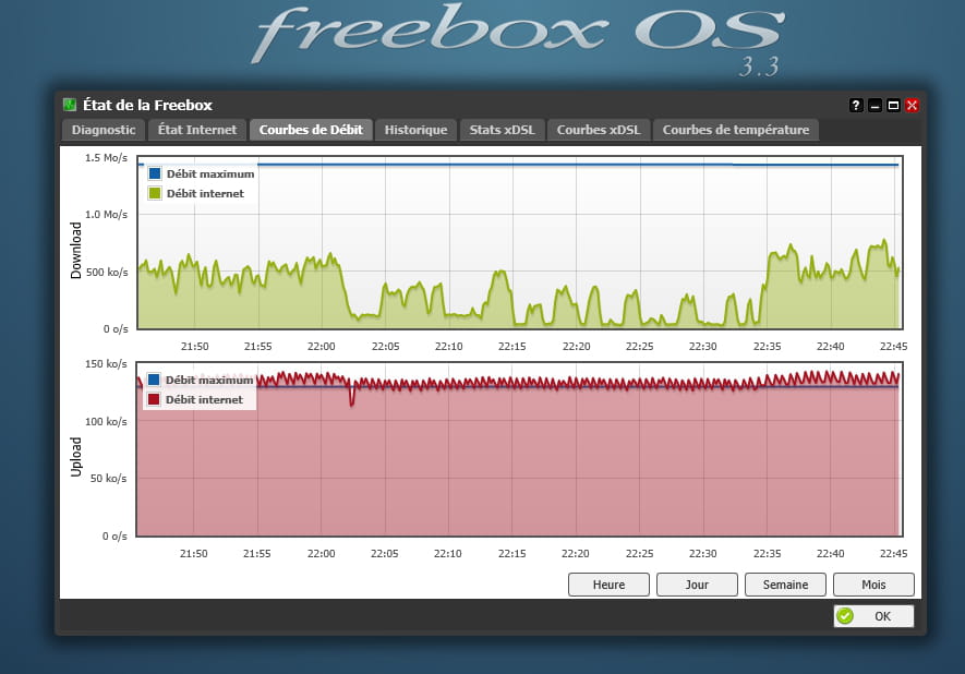 J'ai vérifié mon débit descendant, il est normal. Mais mon débit montant est anormalement saturé, et ne baisse pratiquement jamais, même si je suis seul connecté chez moi, TV éteinte.
