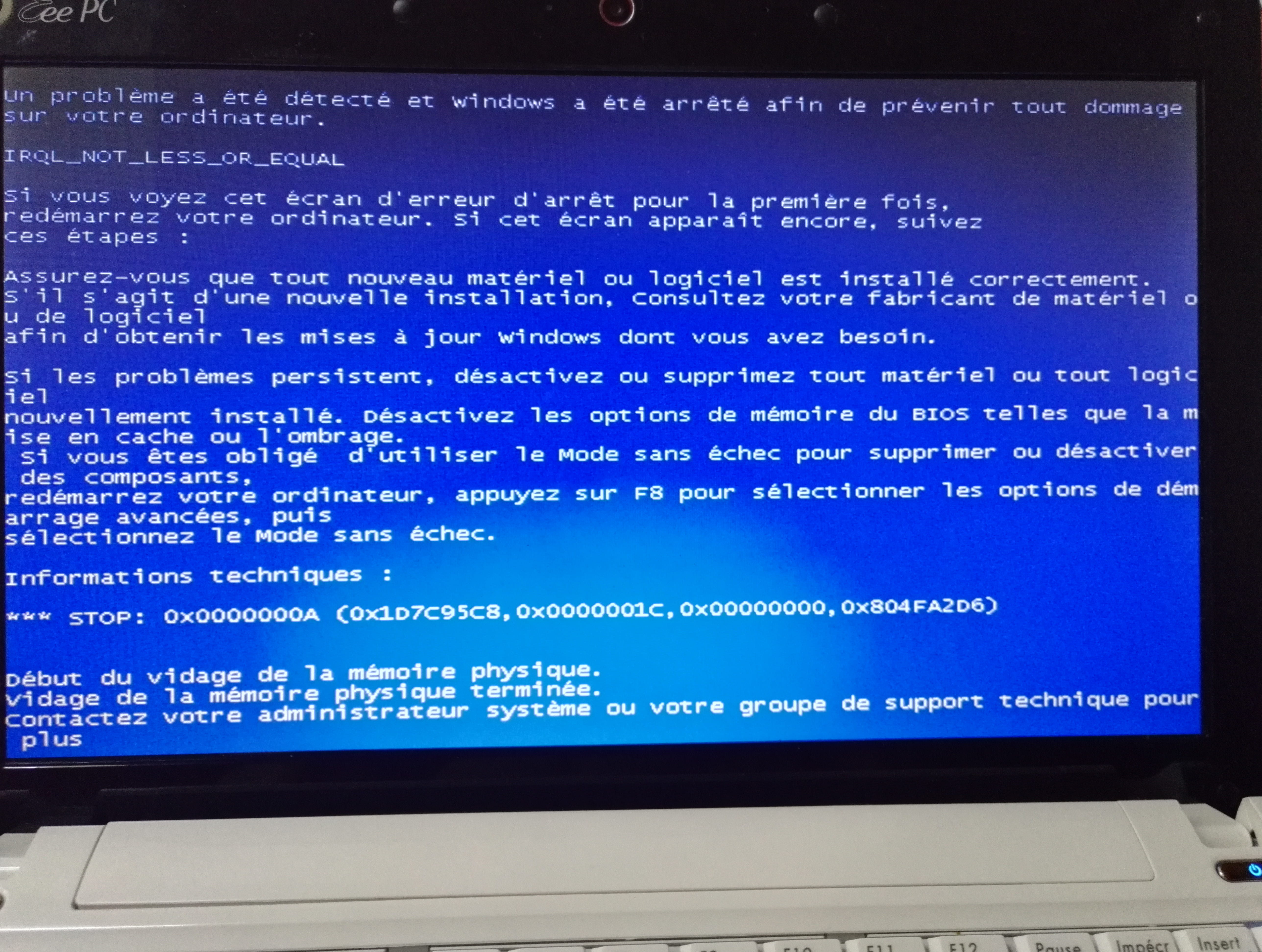 Bonjour, je possède un ordinateur portable sous windows XP et j'ai un problème. C'est un Asus Eee PC 1101HA. Alors voilà, lorsque l'allume mon PC tout va bien mais au bout d'une dizaine de minutes d'utilisation le message suivant s'affiche sur mon écran. Je suis donc obligé de le redémarrer de force en appuyant sur le bouton power. J'ai essayé de restaurer les valeurs d'usine mais il ne sait rien passé. Merci de bien vouloir m'aider !