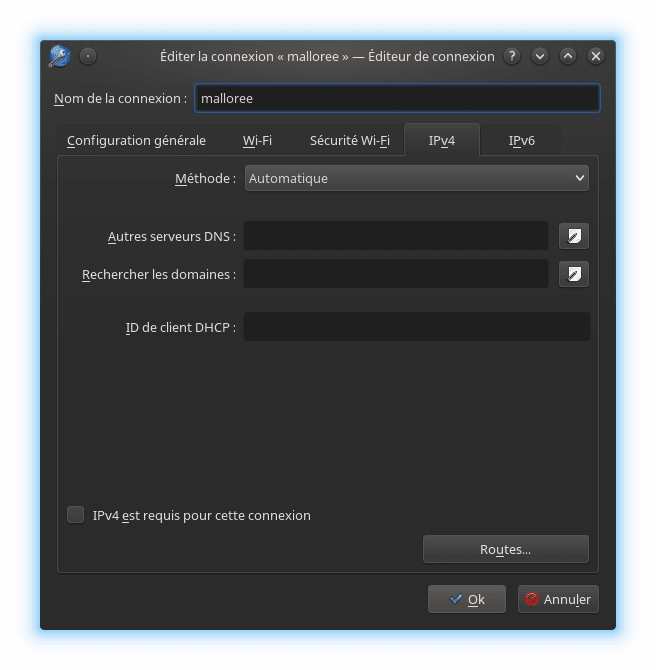 Typiquement dans la fenêtre ci-dessus on voit que l'onglet IPv4 permet de spécifier le(s) serveur(s) DNS à utiliser.