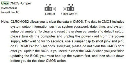C'est bon j'ai trouver un site pour pouvoir faire un clear CMOS mais avec le jumper cela ne fonctionne pas du coup je fait avec la pile