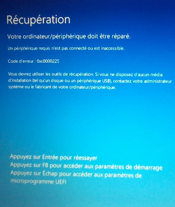 Message d'erreur 0xc0000225 Windows 10