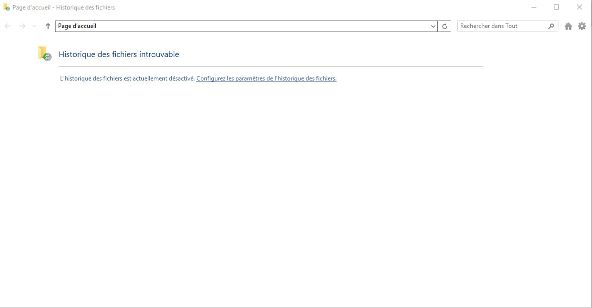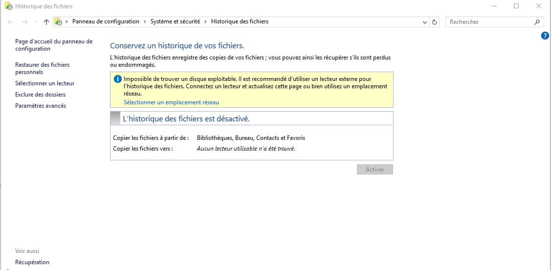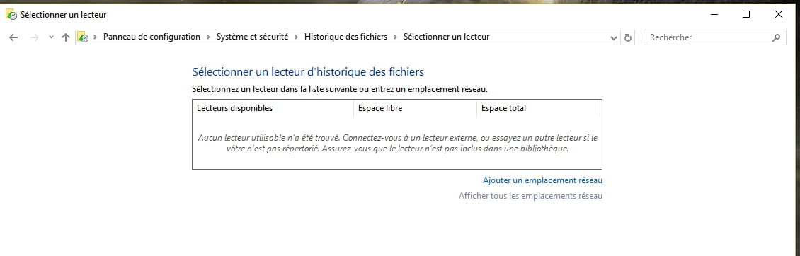 Le système de sauvegarde Windows 10 ne trouve aucun disque exploitable.