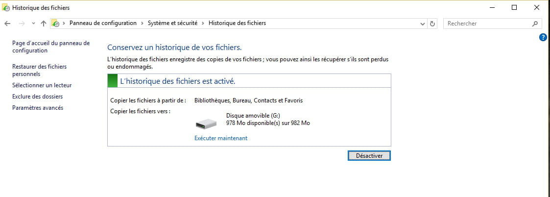 Merci pour votre diligence. Oui, il s'agit bien de la 2ème option " l'historique de fichiers pour sauvegarder ses documents" Les 2 disques sont visibles dans l'explorateur mais pas dans l'historique (captures d'écran en P.J.)