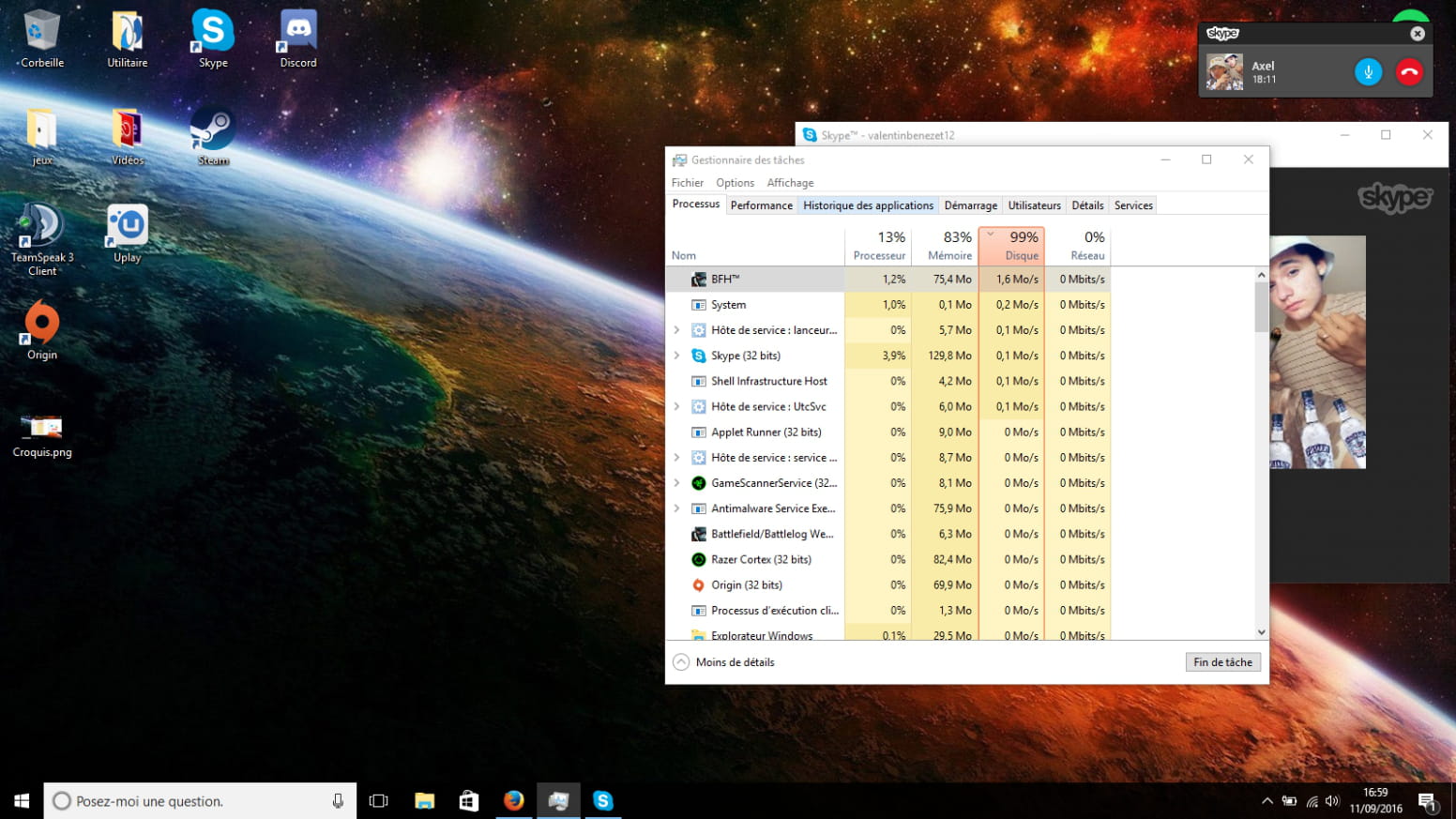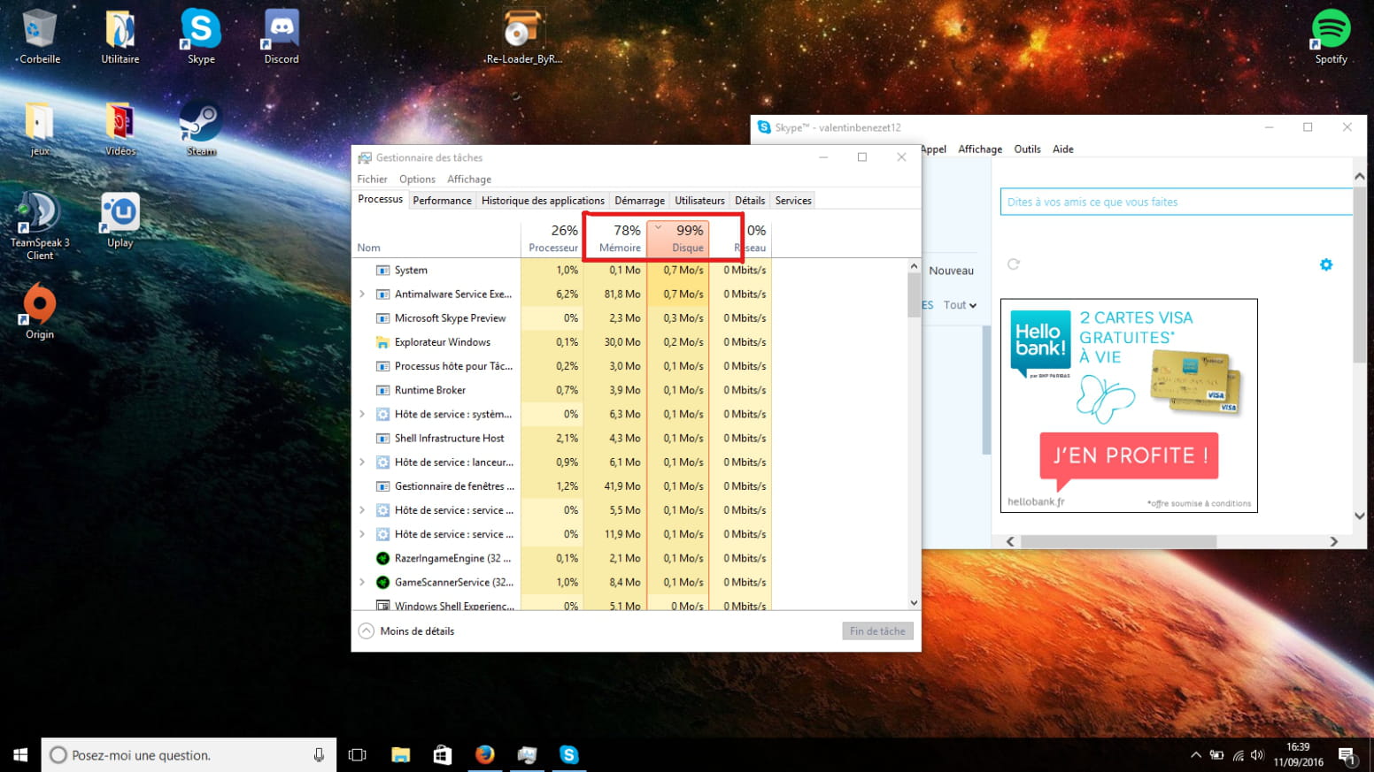 J'ai donc regarder mon gestionnaire des tâches, et la je vois le disque dur a 100%, j'ai tout quitter, et j'ai vu que le disque dur étais toujours a 100%