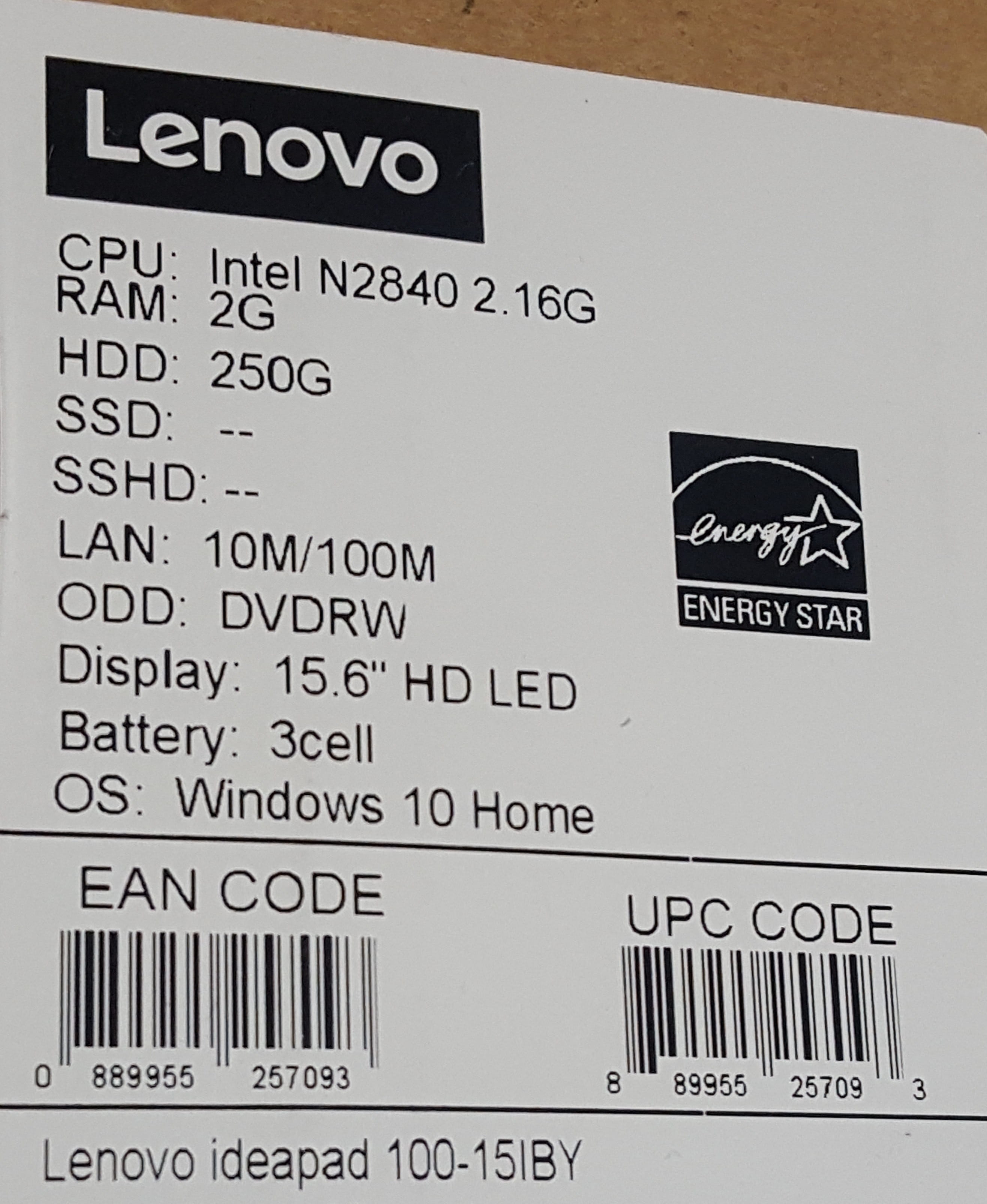 Intel(R) Celeron(R) CPU N2840 @ 2.16GHz , Mémoire RAM 2,00 Go (1,88 Go utilisable), HDD 250 Go, systeme 64 bits, processeur x64, windows 10.