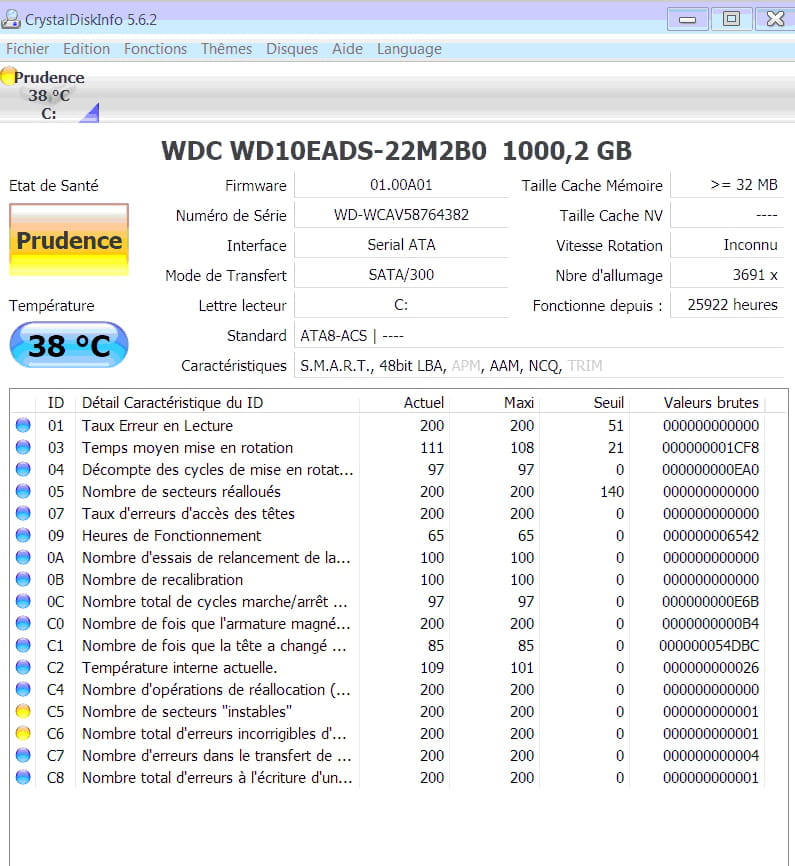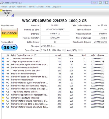 - CrystalDisk Info me dit d'être prudent