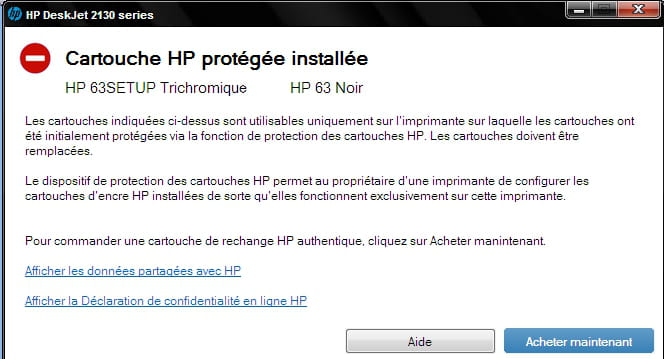 Je viens d'acheter 2 cartouches deskjet Color & Black, lorsque je les insère dans mon imprimante HP Deskjet 2130, voici la notification qui s'affiche en pièces jointe. Pourquoi les cartouches sont-elles protégée alors qu'elle vienne nouvellement de la boutique ? Le vendeur refuse de les changer parcque je les ai déballer.
