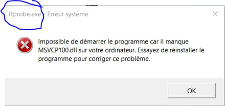 Bonjour, quand j'ai allumé mon ordi (Windows 10) un message "Impossible de démarrer le programme car il manque MSVCP100.dll sur votre ordinateur. Essayer de réinstaller le programme pour corriger ce problème" c'est afficher, je l'ai fermé et 10 sec plus tard il s'est de nouveau ouvert, j'ai d'abord cru que c'était mon logiciel antivirus qui avait un problème car il ne s'est pas ouvert (c'est SFR Antivirus), je l'ai donc désinstallé mais le message est resté. Par contre il ne se réinstalle plus j'ai donc installer Avast Free Antivirus. Ensuite, j'ai fais des analyses avec les logiciels suivants: Adwcleaner, Malwarebytes Anti-Malware et Avast qui n'ont rien donné. Après j'ai chercher une solution sur internet, d'abord "ffprobe.exe" car j'ai cru que c'était à cause de ça (voir screenshot, si ça marche, je suis nouveau ^^), mais visiblement ce n'était pas ça, j'ai donc chercher "MSVCP100.dll manquant" et j'ai trouvé plusieurs réponse mais je ne suis pas sûr qu'elles résolvent mon problème. Quelques précisions aussi: