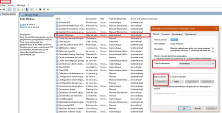 Vérifier que le service Audio Windows est démarré automatiquement.