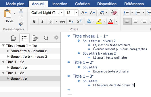 Sur la gauche, dans le volet Navigation, j'ai choisi (d'un clic droit) d'y afficher les titres de niveau 1 et 2. Dans le document en mode plan, en double-cliquant sur les signes plus ou moins (selon le cas) on développe ou on condense les niveaux inférieurs.
