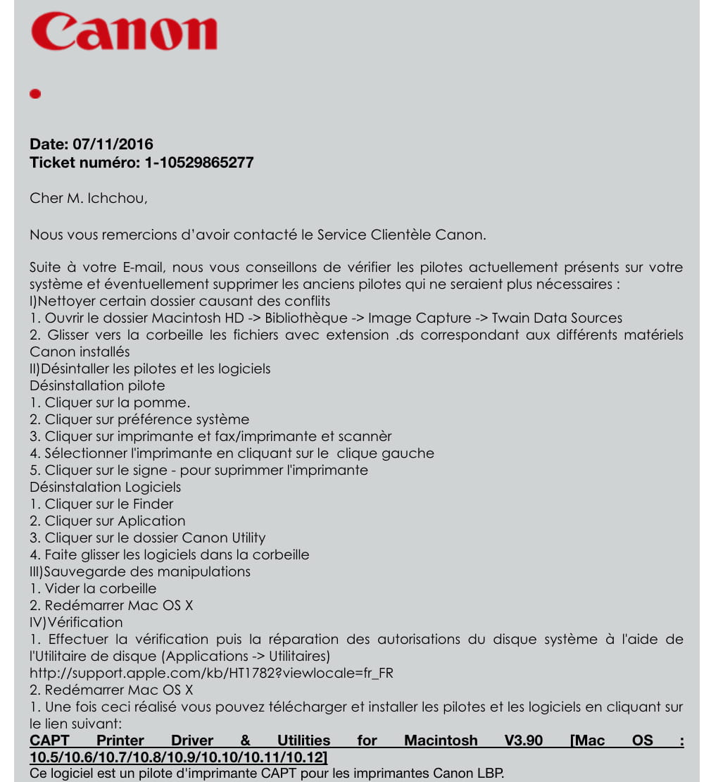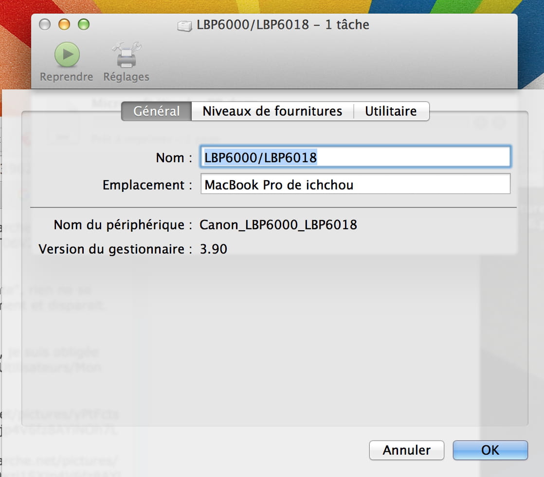 Je reviens donc au point de départ ;-( mais je garde espoir. En fait, j'ai un gros doute sur la version 3.90 du driver que Canon propose dans le cas du Mt Lion 10.8.5 (Mac_CAPT_V390_uk_EN.dmg). Je sais qu'il existe des versions antérieures (3.67; 3.80; 3,85...) mais je ne sais pas laquelle marchera (sachant que j'avais déjà essayé d'installer la 3.85 en vain).