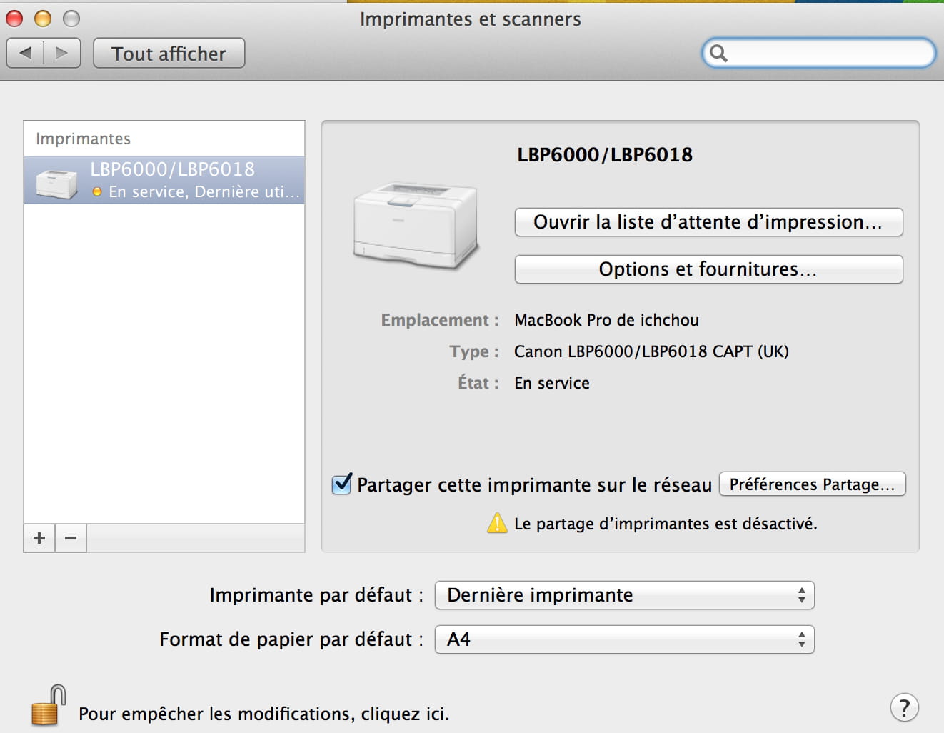 État de l'imprimante quand je l'ai rajoutée dans Préférences Système:
