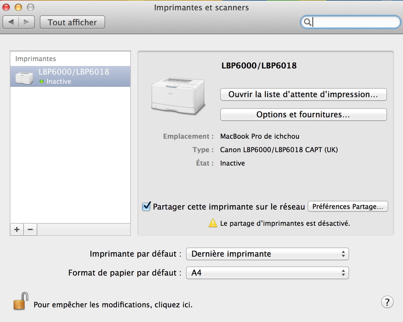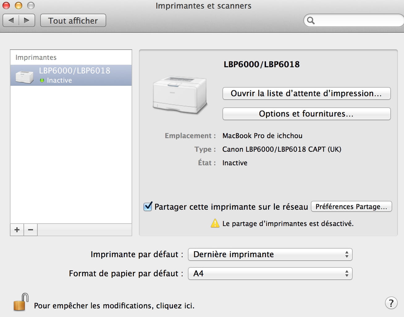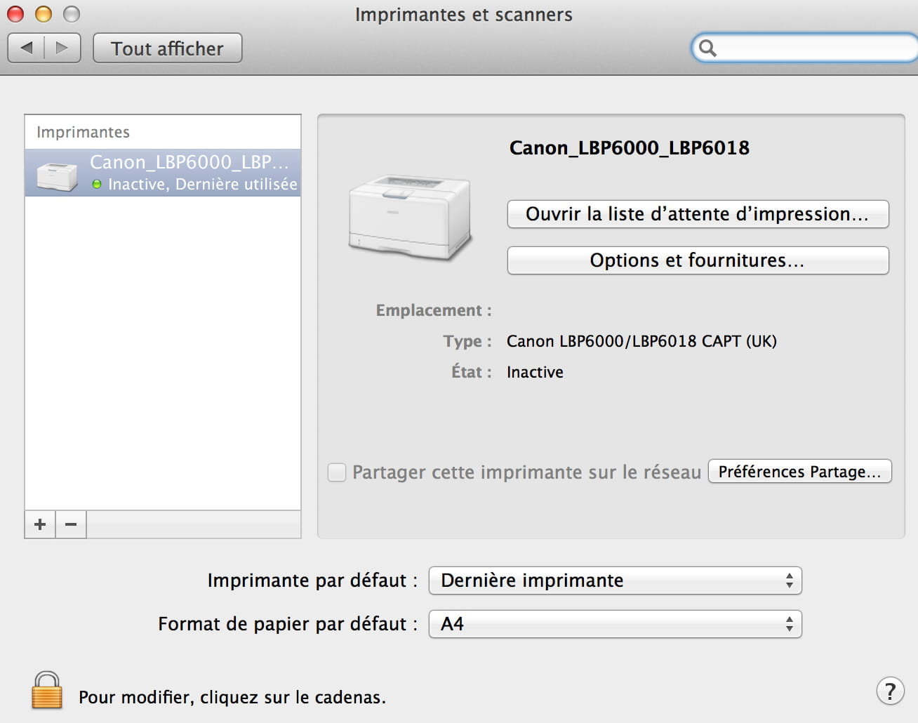 Canon LBP6000B n'imprime pas sous Mac OSX Mt Lion 10.8.5