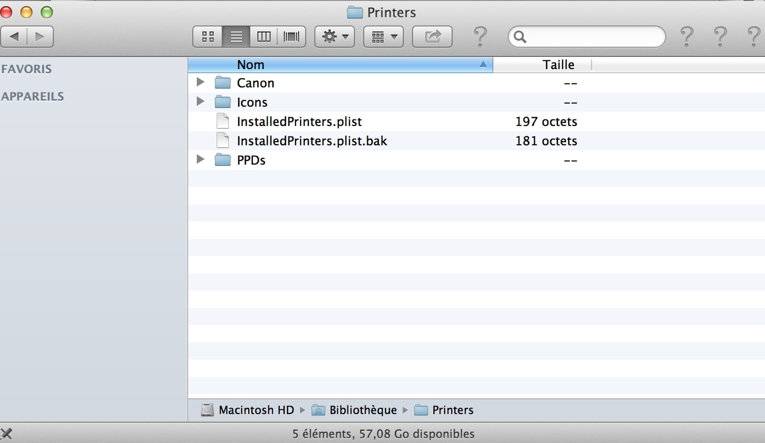 Nom_du_disque_dur / Système / Bibliothèque / Printers