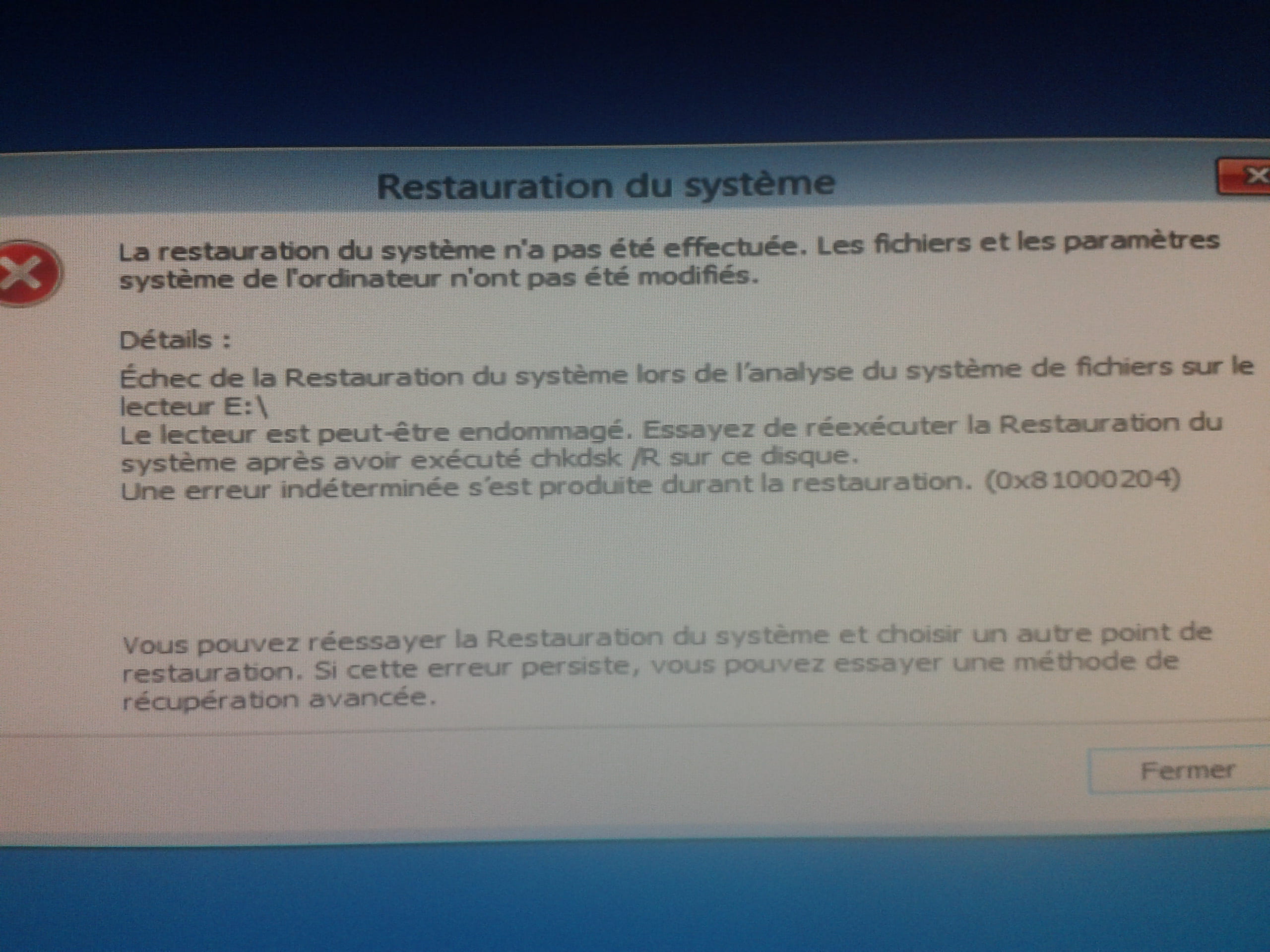 J'ai aussi essayé de lancer une restauration du système depuis un point antérieur, et bizarrement le seul point que ça me proposé datait du matin même... J'aurais préféré plus ancien mais impossible.... Et cette restauration a échoué avec un message et un code erreur.