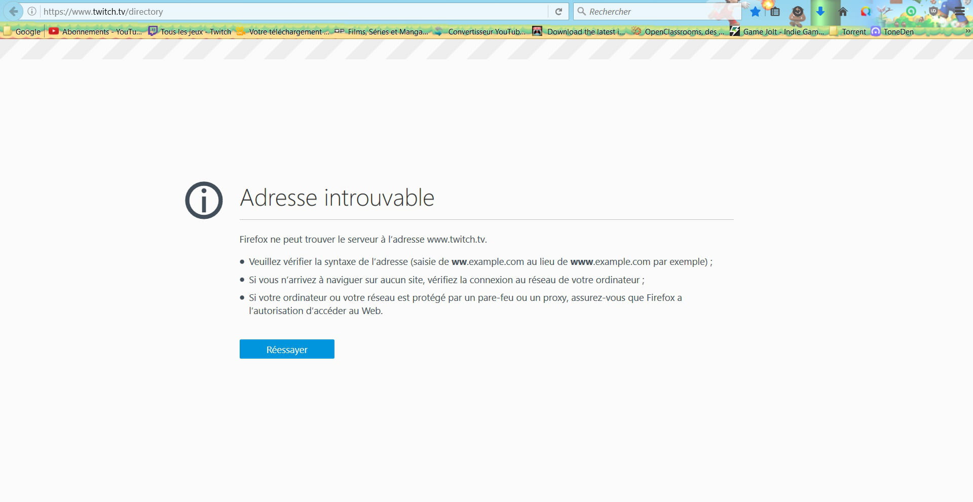 Depuis maintenant environs 2 à 3 semaine, mon navigateur, firefox ou opéra, m'indique un message d'erreur de temps en temps (je précise c'est important), sans conditions particulière. Lorsque je navigue sur internet et qu'à un moment quelconque je clique sur un lien, le navigateur m'indique que je ne suis pas connecté à internet, ce qui est faut, parfois la page/ vidéo mouline un peu avant le message, parfois elle indique le message directement :