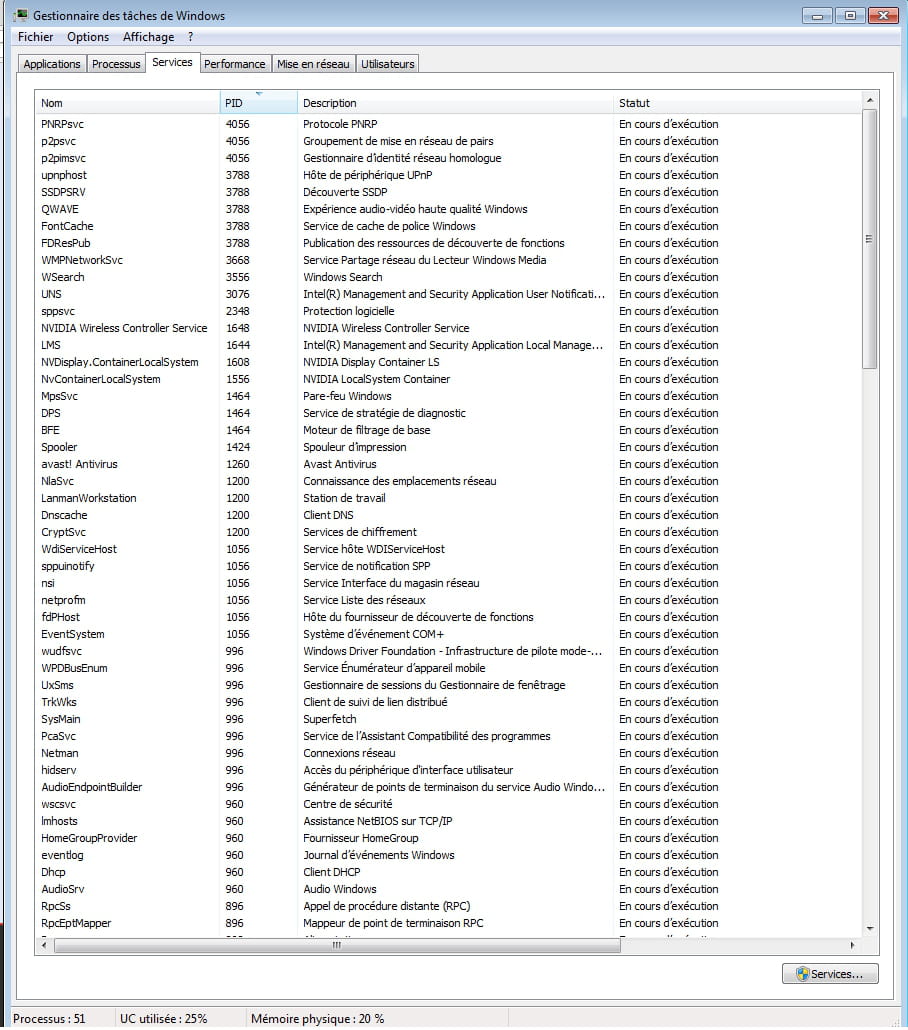 Sinon voir du côté des processus svchost, généralement c'est eux qui posent souci.