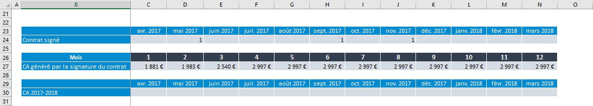 Dans le troisième tableau, je voudrais renseigner le CA généré par mois, à partir du mois de signature du contrat.