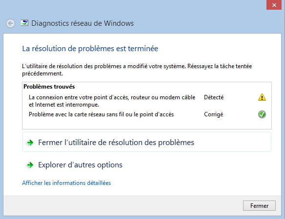 Le plus bizarre, c'est que me déco-reco de ma box internet résout le problème pendant quelques temps (entre 1 et 10 min tranquilles, pas de quoi faire grand chose), et que, certaines fois (1/5 environ), l'utilitaire de résolution de problème redémarre ma carte réseau et tout remarche, jusqu'à la fois suivante...