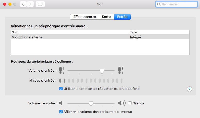 Et là, rien ne se passe, comme si l'ordinateur ne détectait pas le micro. Quand je vais dans Préférences Système/Son/Entrée, seul le micro intégré apparaît, rien d'autre.