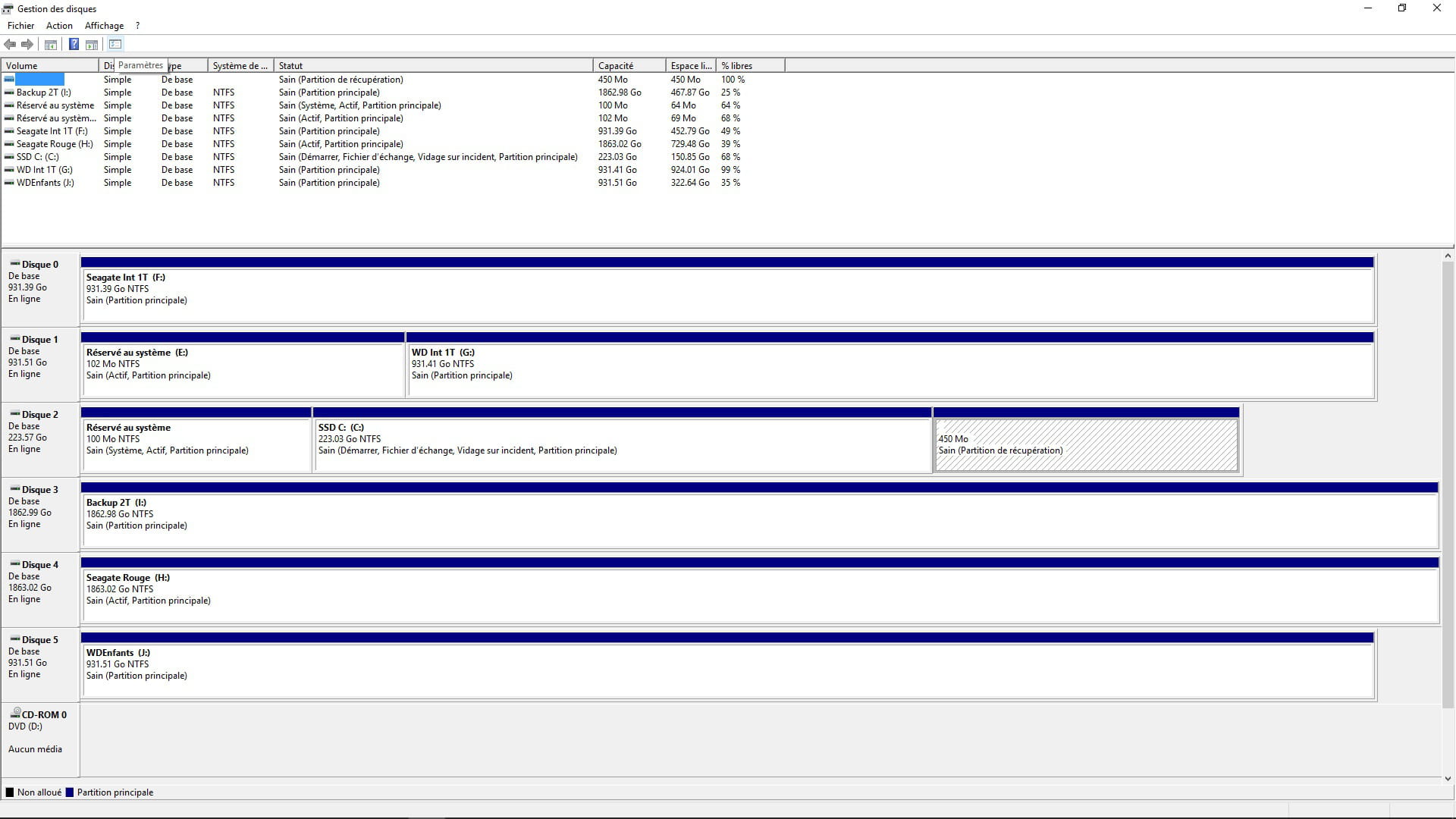 J'ai vérifié le système fichier est en NTSF pour les 2 DD . Sauf que le DD (H) récalcitrant son statue est sain (Actif , Partition Principale ) et l'autre DD (J) sain (Partition Principale) .Je t'ai mis une capture d'écran , j'espère que cela a fonctionné. J'attend pour la suite . Pour récupérer j'ai le programme Wondershare Data Recovery mais je n'ai pas suffisamment de place pour mettre toutes les données . J'attend un DD de 4 To dans 3 a 4 jours .