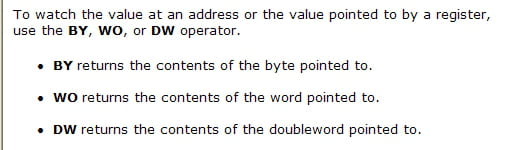 Dans VC++ l'expression "dw(esp+0x04)" tapée dans une ligne de l'écran Watch affiche bien le CONTENU de l'adresse désignée par le registre esp + 0x04.