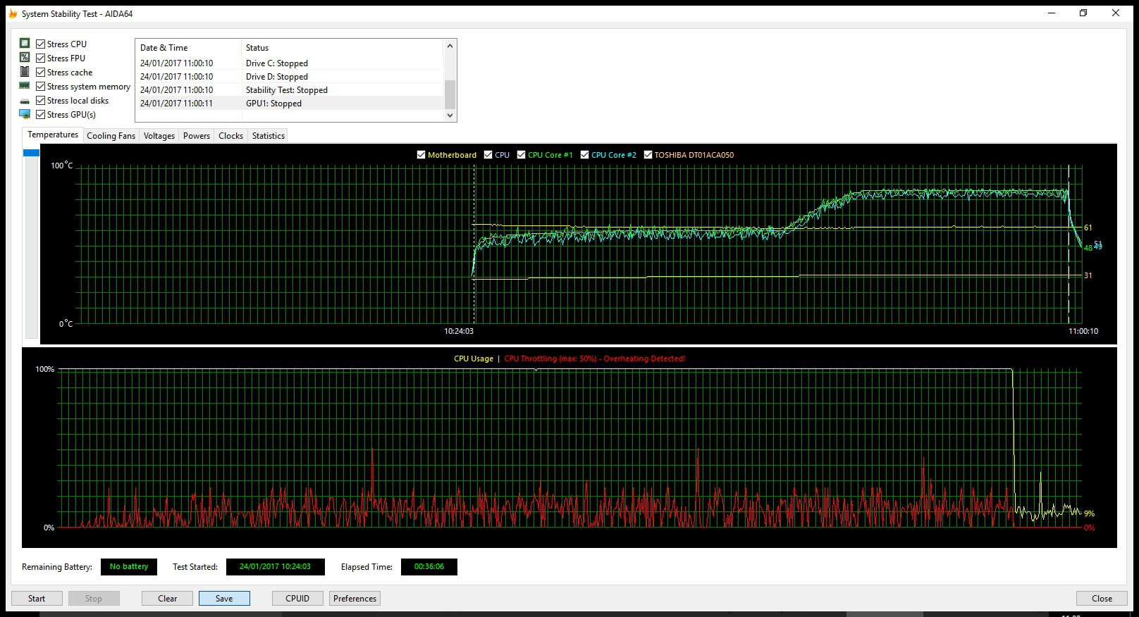 j'ai installé AIDA64 et j'ai fait un test de fonctionnement qui me donne ceci: overheating detected -cpu throtting max 50%.