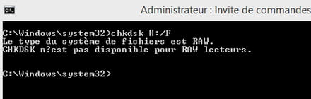 La commande " chkdsk H: /F" affiche le message suivant:"Le type du système de fichiers est RAW.