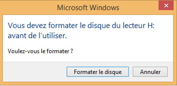 lorsque je connecte mon flashe USB le systeme m'affiche un msg "Vous devez formater le disque du lecteur H: avant de l'utiliser"