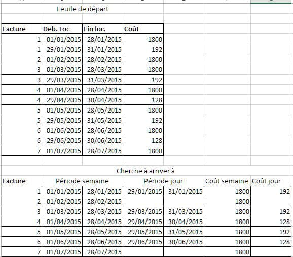 Mon problème est de mettre sur une même ligne correspondant à un numéro de facture (chiffre Ax) les différentes périodes et les coûts correspondants qui sortent en lignes et sur plusieurs colonnes.
