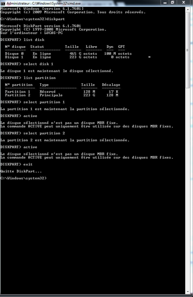 select partition 1 mettre le N° de la partition B: de 223 Go , la 1 en principe