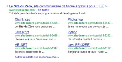 Je m'occupe de plusieurs sites Wordpress pour le boulot et je souhaiterai améliorer le référencement en obtenant ce type de liens sur Google (voir l'image), avec un lien principal puis plusieurs liens vers des pages spécifiques.