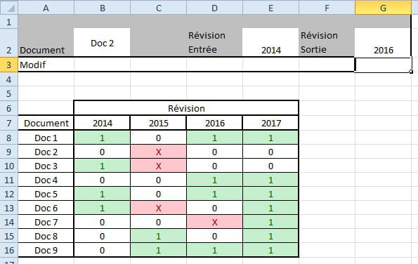 Les révisions mineures sont indiquées par un entier. En revanche, les révisions majeures sont repérées par des "X". L'idée est donc, une fois qu'un document est indiqué en cellule B2, qu'une révision d'entrée est indiquée en E2 et une révision de sortie en G2, une réponse comme OK, ou NOK soit affichée en B3 par exemple.