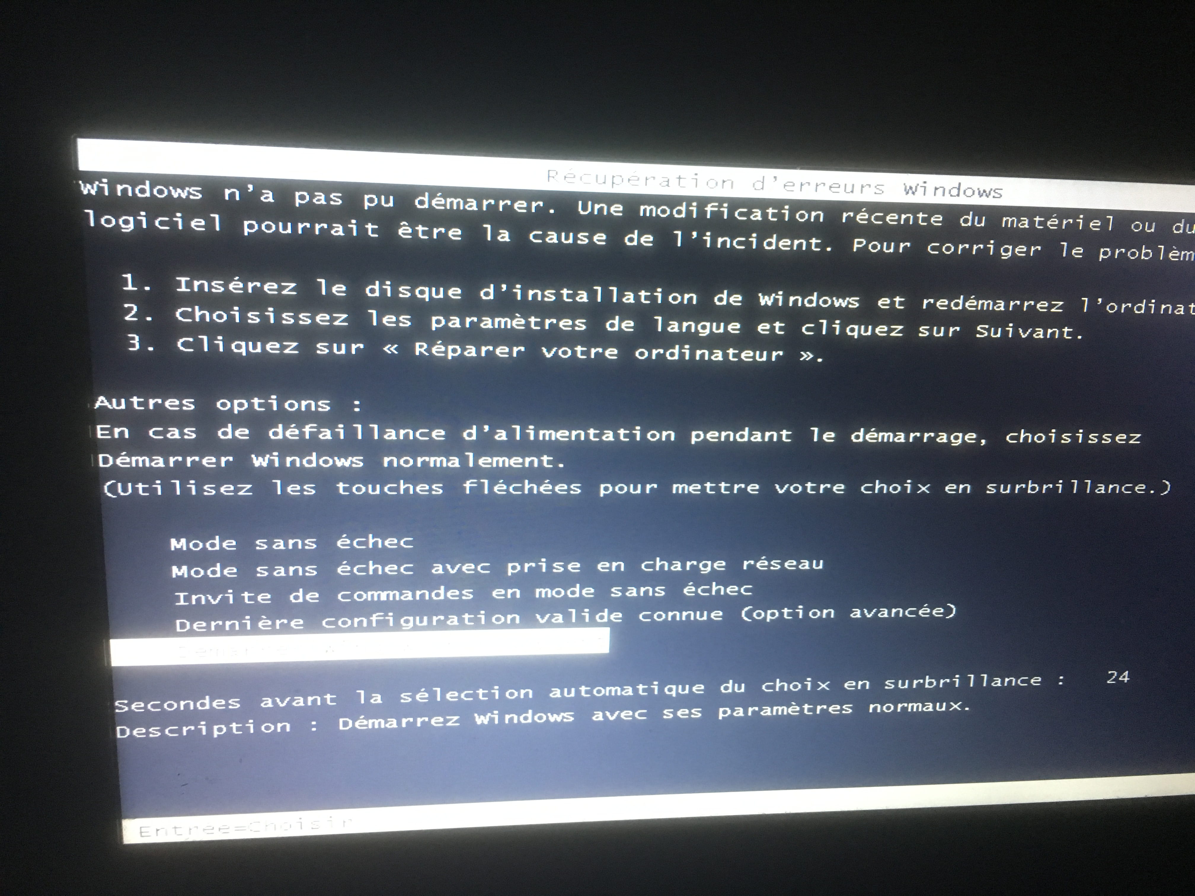 J'ai un ordinateur portable quand je l'allume je mets le mode sans échec, démarrer l'ordinateur normal,... je fais tout et à chaque fois ça recommence au début impossible de le démarrer normalement comment faire s'il vous plaît