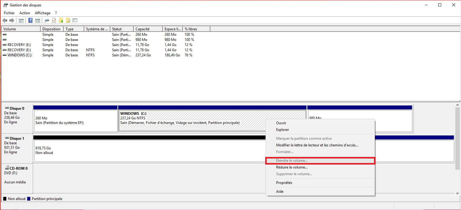 Ensuite clic droit sur le lecteur C: et Ettendre le volume...